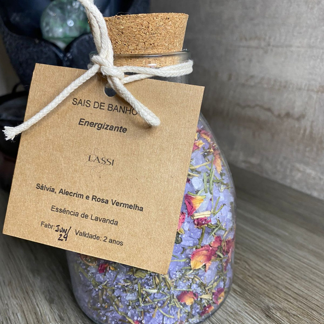 1 embalagem de vidro contendo 500gr de sais de banhos e ervas: sálvia, alecrim e rosas vermelhas.